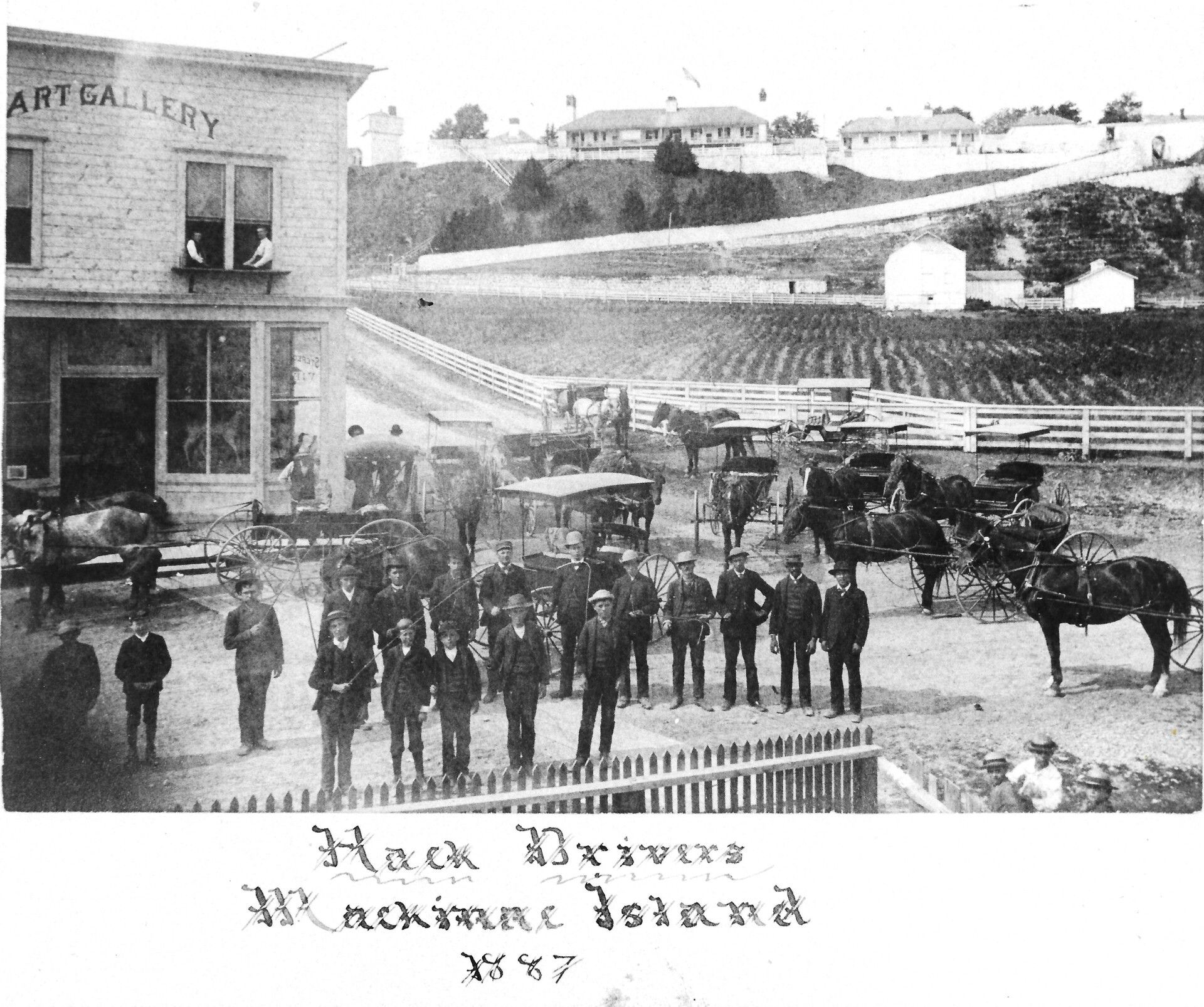 A group of commercial carriage drivers pose gathered at the corner of Main and Fort streets. It was the carriagemen who took the lead in banning cars on Mackinac Island.